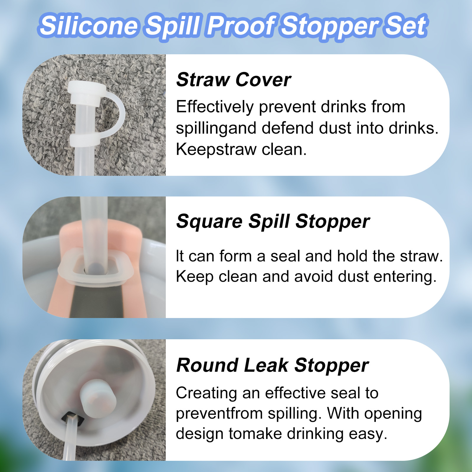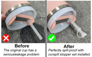 Includ Component – These spill proof accessories including 2 straw cover sets, 2 round Leak stoppers and 2 square spill stoppers.